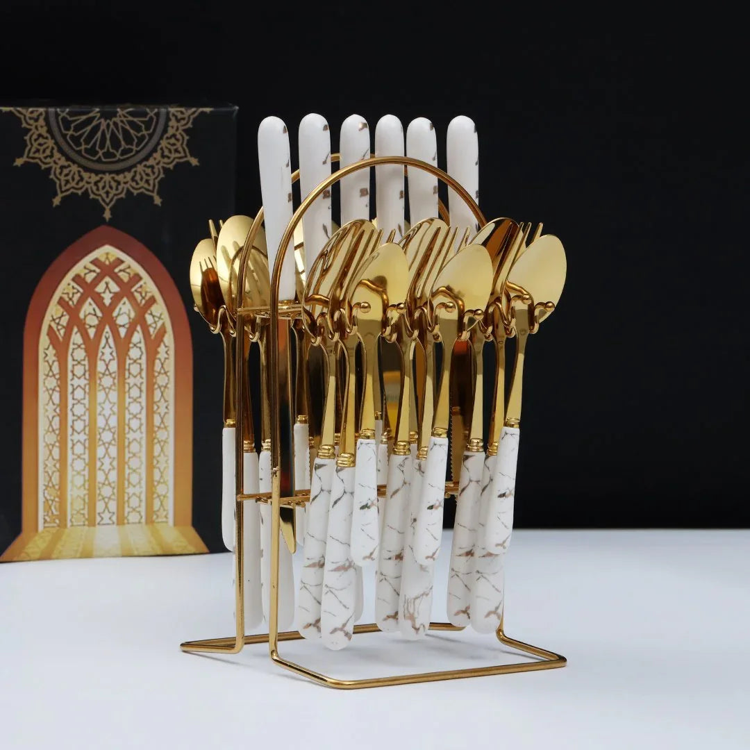 White Marblene Pattern Grip 24 Pcs Cutlery Set